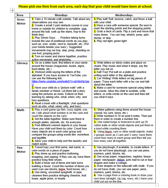 Monday/Wednesday and Tuesday/Thursday NTI choice board.